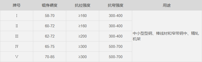合金無限冷硬鑄鐵軋輥,其工作層中有細(xì)小晶間石墨。石墨和碳化物的大小、開關(guān)、分布可通過激冷作用和合金含量來控制。由于添加了錳、鉻、鎳、鉬等合金元素,基體組織可以從珠光體、貝氏體變體為馬氏體。加上有少量細(xì)小石墨存在,不僅提高了軋輥抗剝落性、抗熱裂性和耐磨性能,而且輥身工作硬度落差很小。適用于棒、線材、型鋼軋機(jī)中軋、精軋機(jī)架。