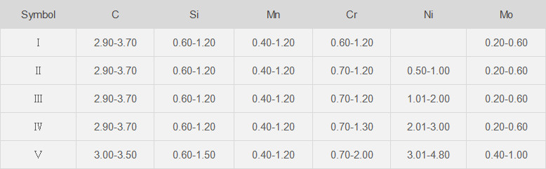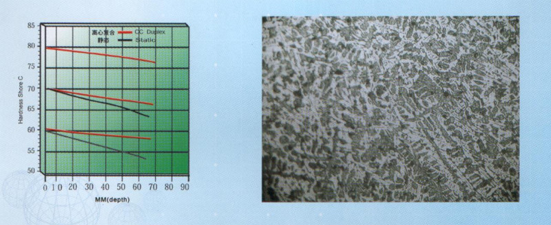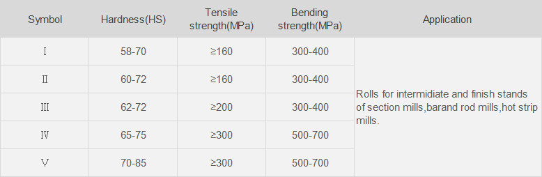 Alloy indefinite chilled rolls is a cast iron roll with fine intercrystalline graphite evenly distributed throughout the working layer of rollbarrel. The sizes,shapes and distributions of graphite and carbide are controlled by the chilling effect and the contents of alloy elements. The addition of alloy elements such as Manganese,Nickel,Chromium,and Molybdenum changes the matrix microstructure from pearlite, bainite to martensite. The existence of small amount of fine graphite enhances the roll's resistance to spalling, thermal crack and wearability. This roll has small hardness gradient in the working layer of roll barrel and is suitable to medium and finishing stands for bar,wire and profiling mills.